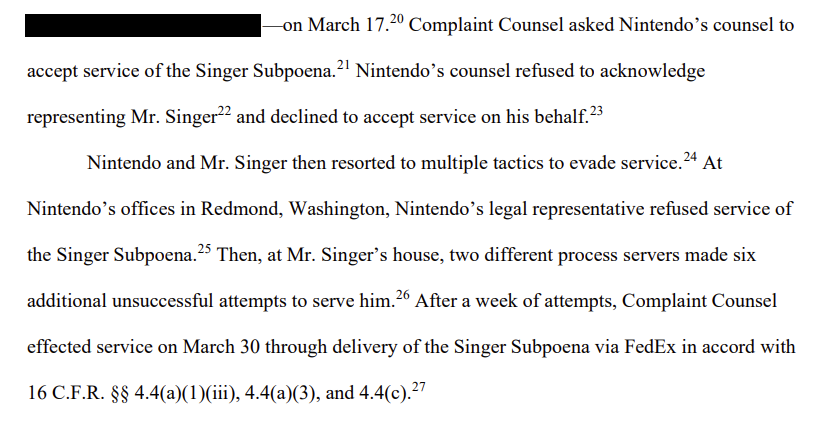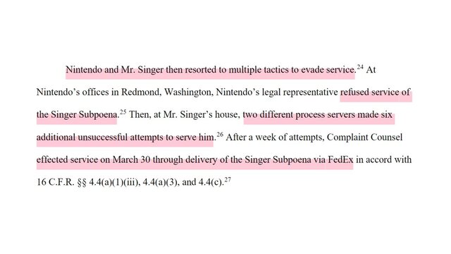 任天堂の法律担当者がSinger召喚状の送達を拒否した。